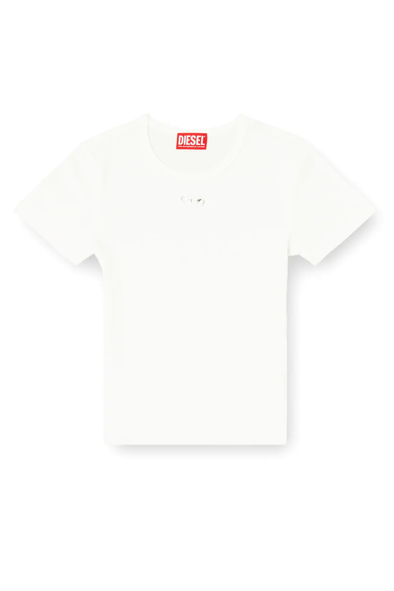 טישרט ריב צמודה עם צווארון קרו ושרוול קצר, צבע לבן, כותנה ריב עם אלסטן, לוגו Oval D מטאלי מודפס מתחת לקו הצוואר, שטיפה למגע רך