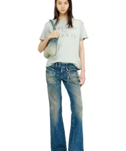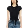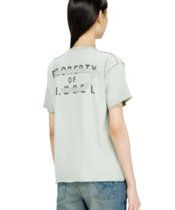 טישרט שרוול קצר בגזרה רגילה עם צווארון עגול מסריגת ג'רזי מכותנה אורגנית, הדפס קדמי ואחורי עם כיתוב לוגו ואפליקציית D בחזית, תפרים מודגשים בצבע טורקיז
