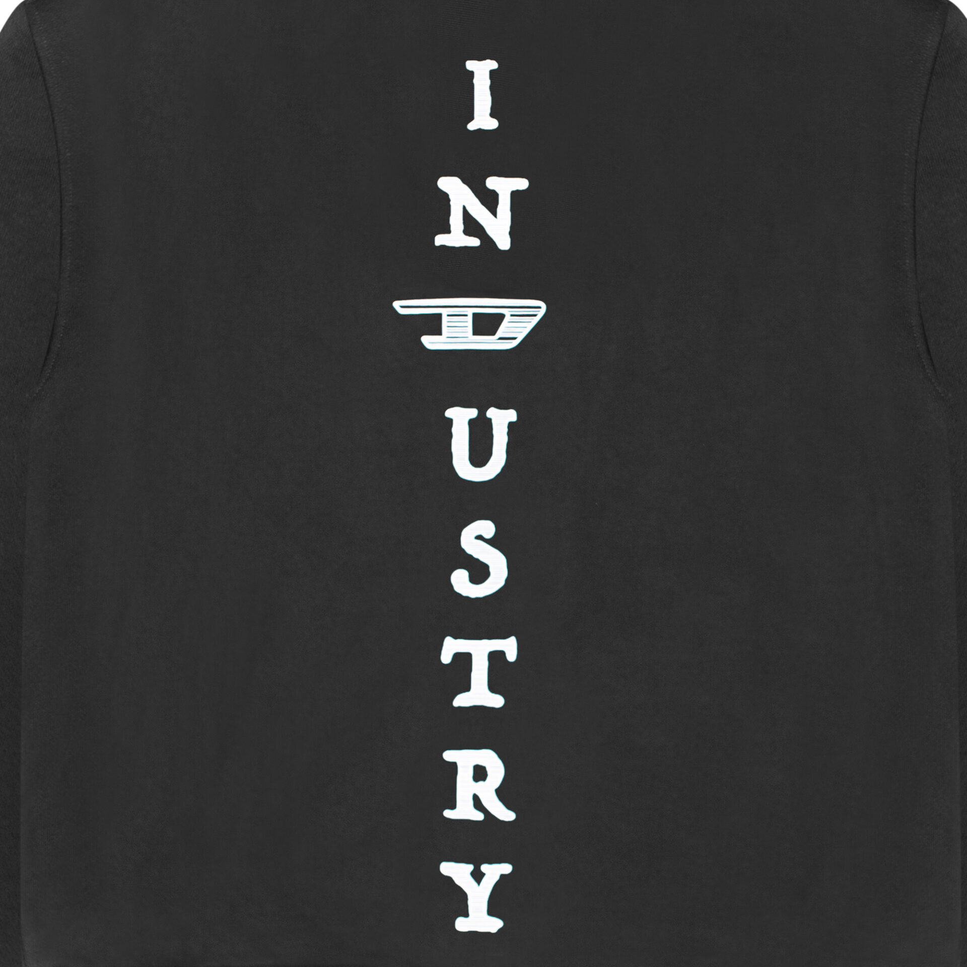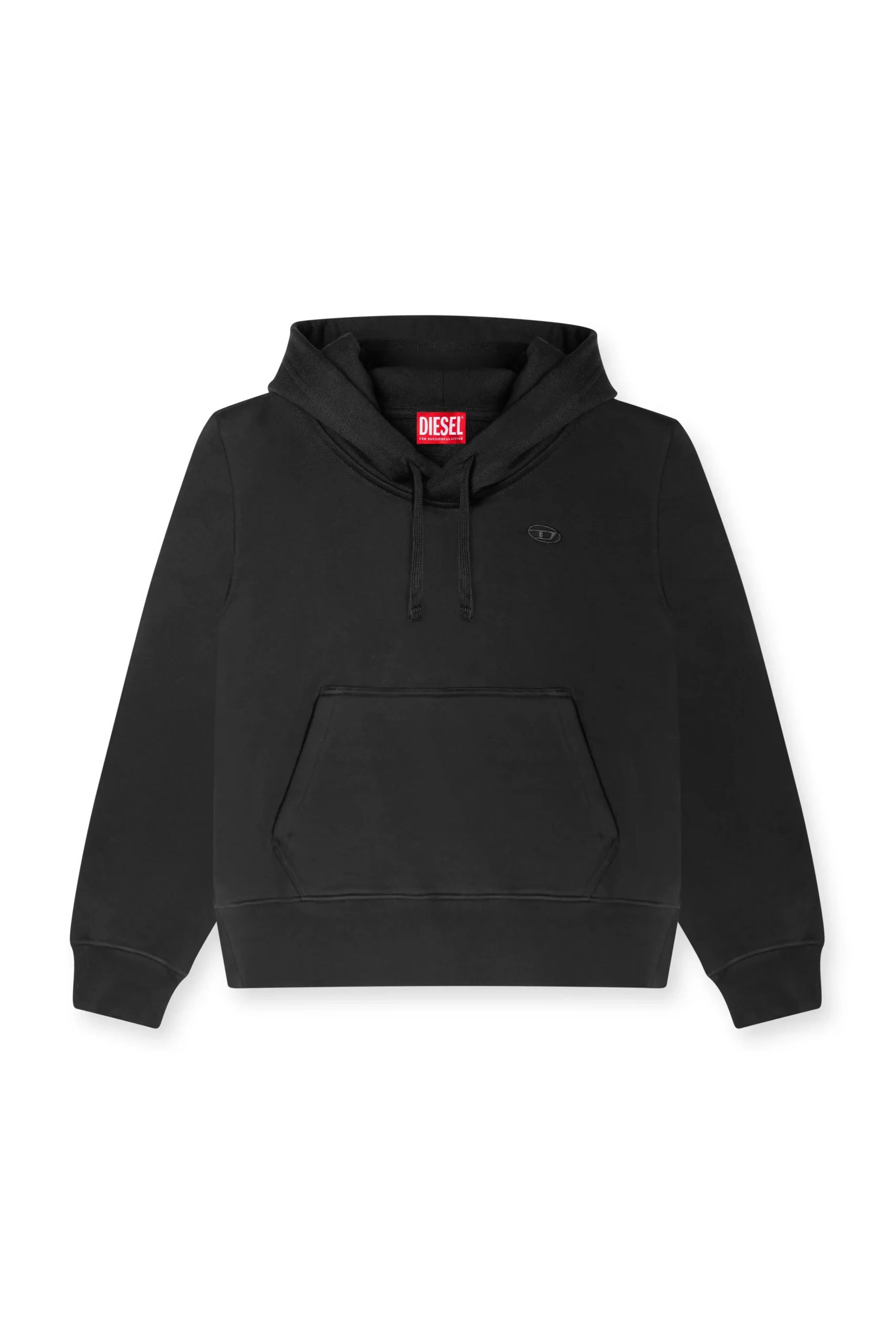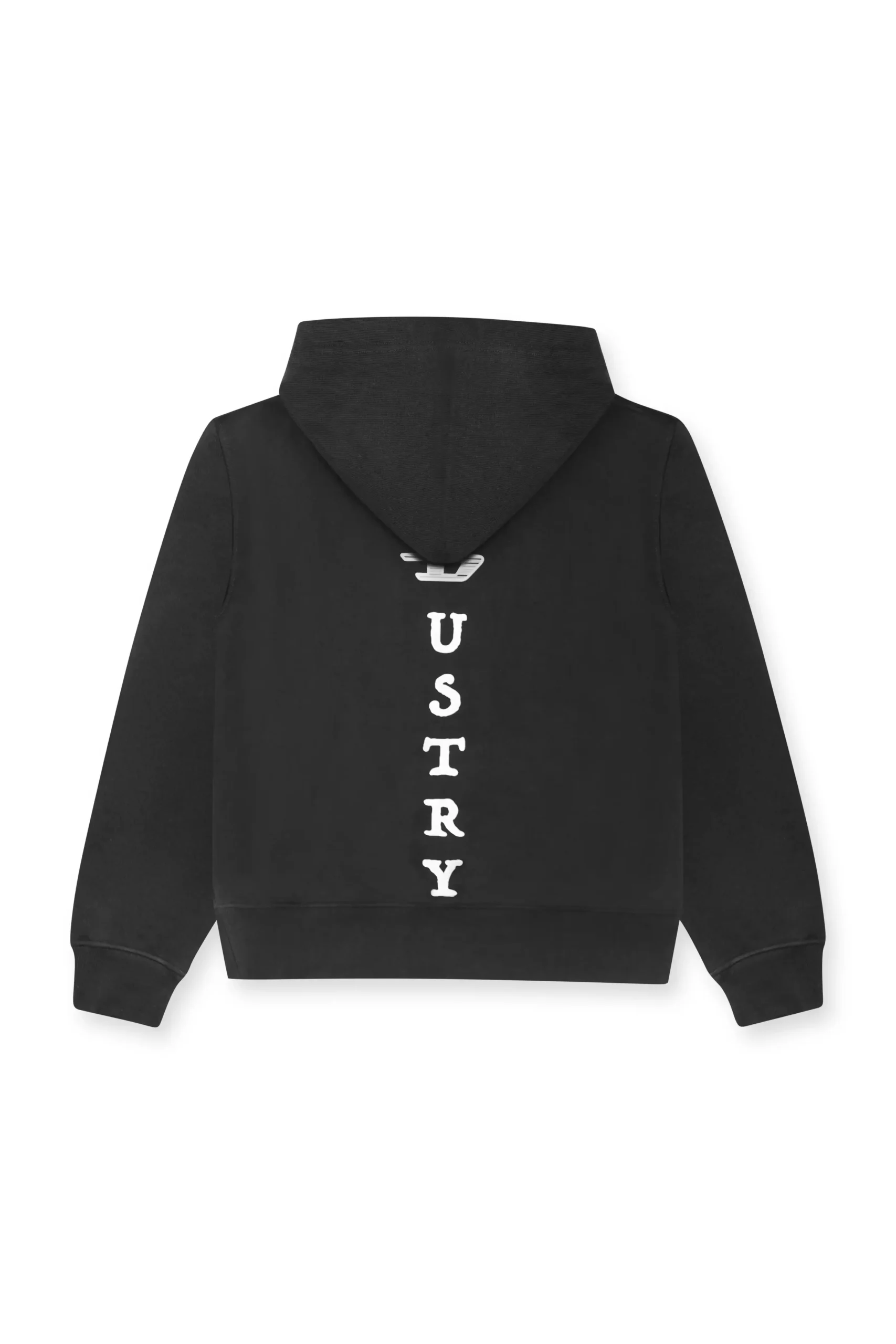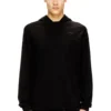 סווטשרט שחור עם הדפס לוגו אנכי מאויר על הגב, רקמת לוגו קטנה בצד החזה, כובע קפוצ׳ון וכיס קדמי