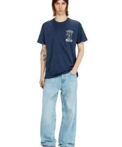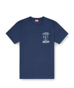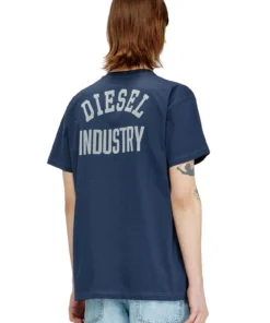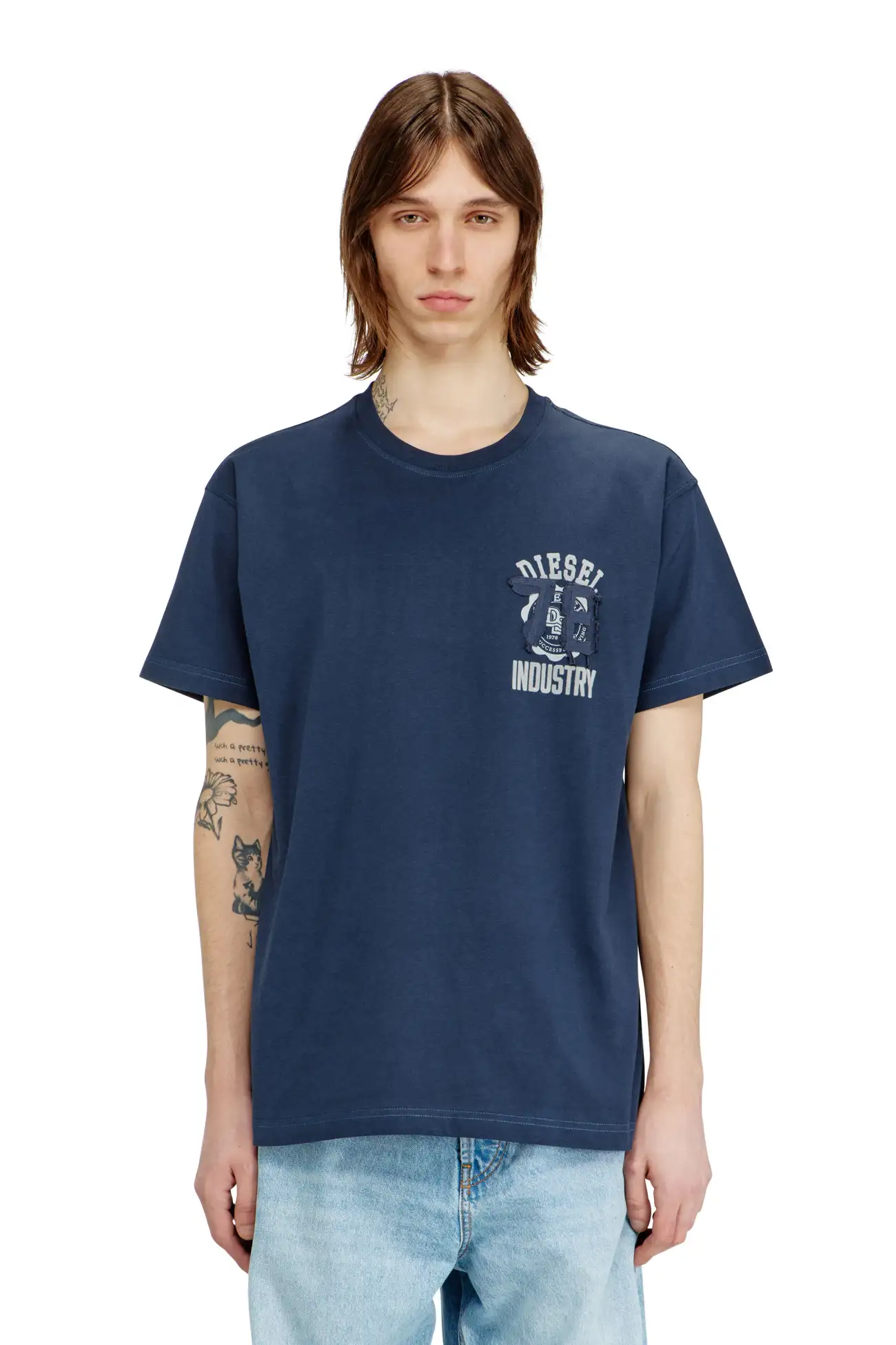 Regular-fit T-shirt for men in organic-cotton single jersey, featuring a crew neck and short sleeves. The front is detailed with a flocked Diesel Industry print and a '78' patch, complemented by a large matching Diesel Industry flock print on the back.