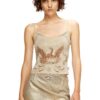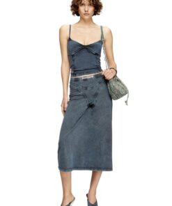 This spaghetti-strap top sits close to the body with a panelled silhouette made from stretch jersey. A treated finish imparts a faded look that gives the illusion of worn-in indigo denim – note the fifth-pocket flag on the side too.