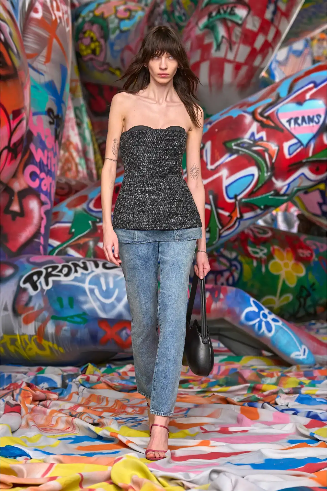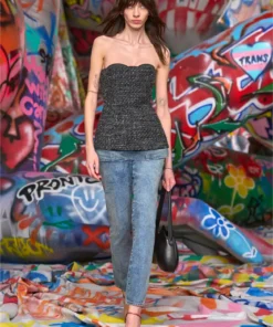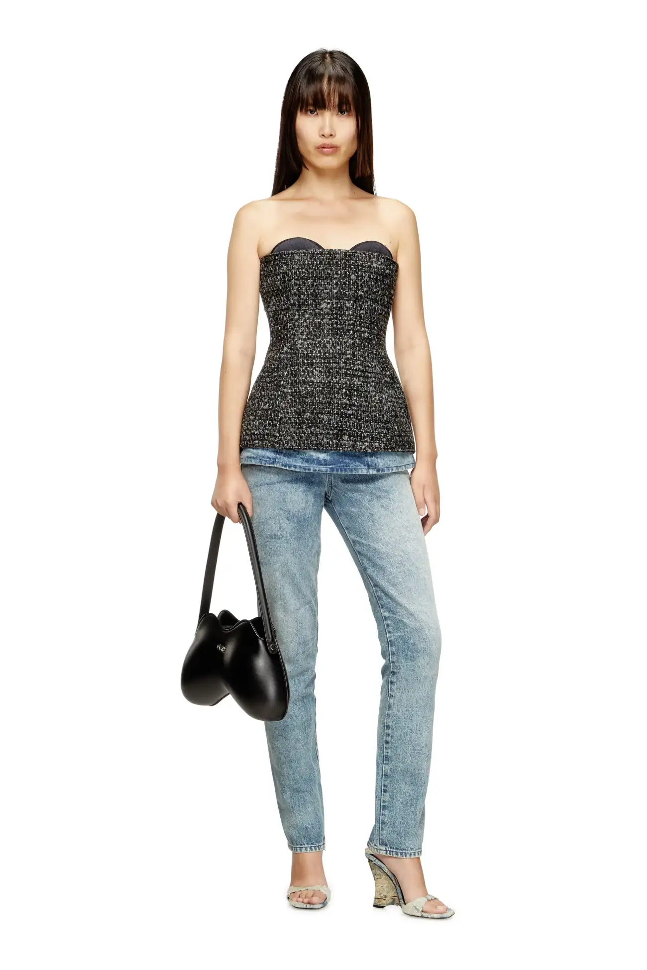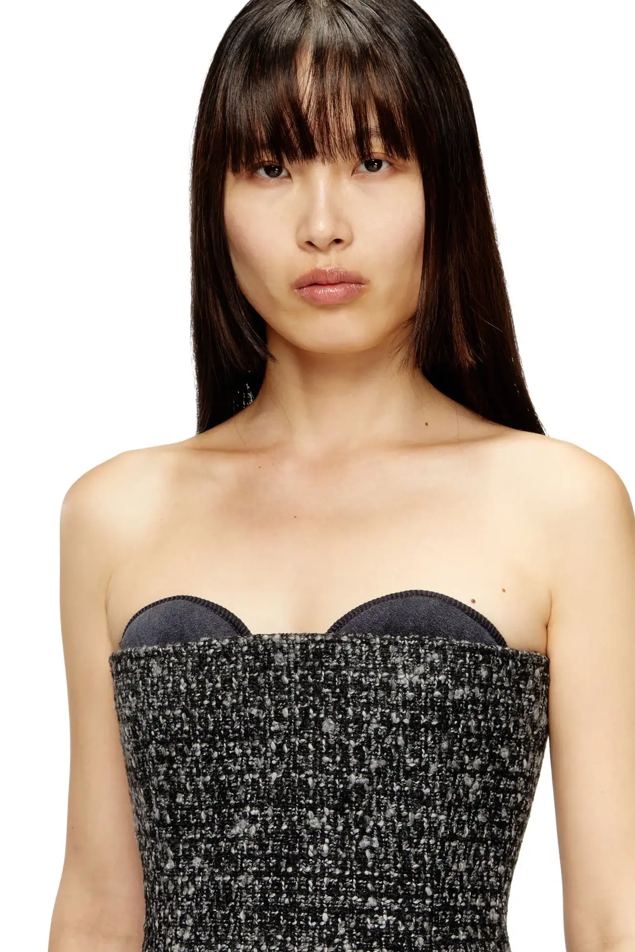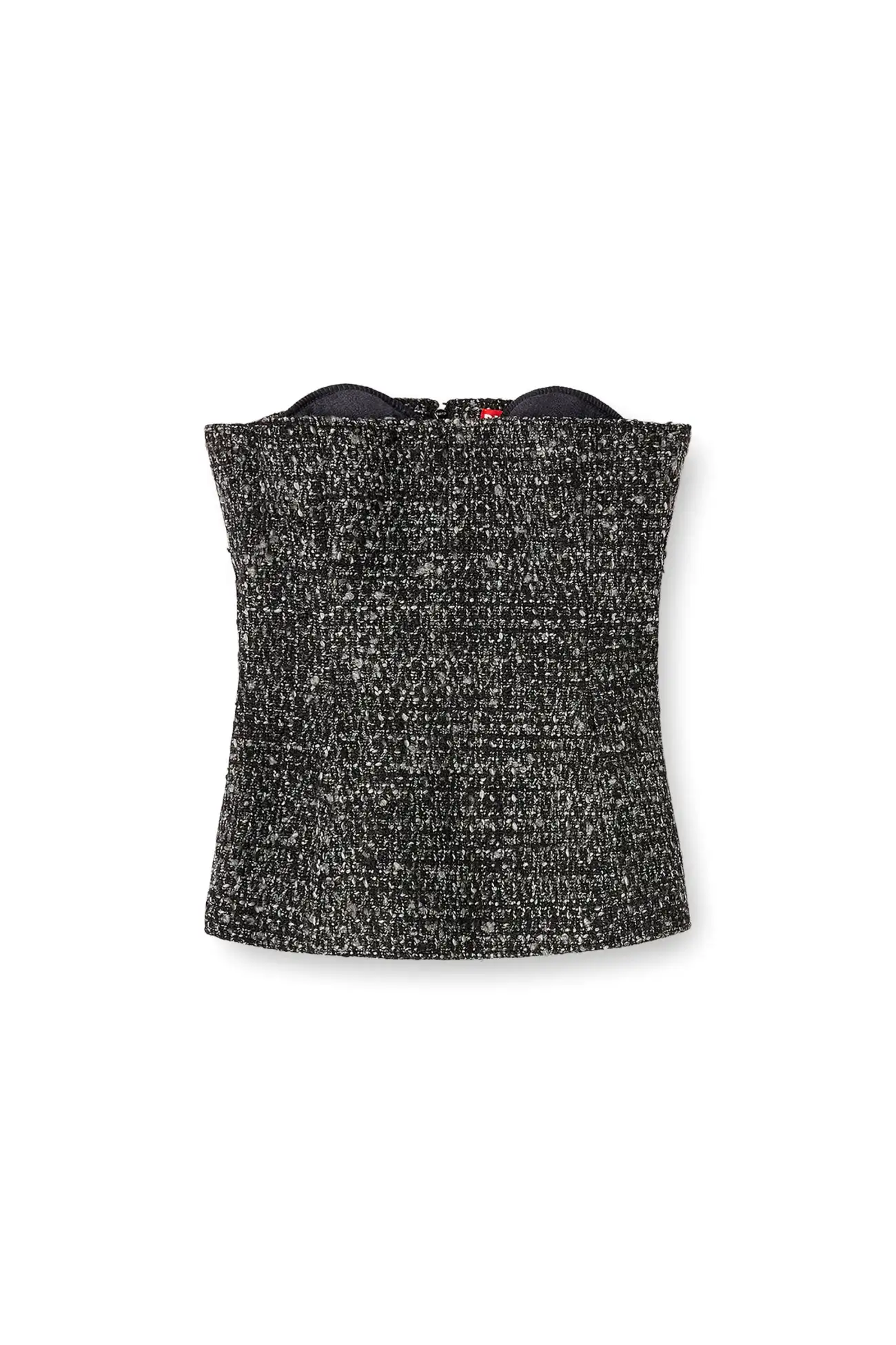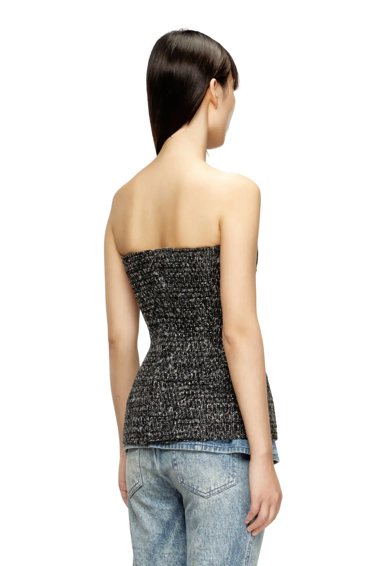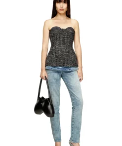 This women's FW25 Runway Show basque is a Diesel take on severe tailoring. Stripped of almost all detail, it features a sharp, fitted-waist silhouette with a ultra-low neckline that cuts straight across the bust – the cups peeking out from beneath defy convention. Complete with a zip-fastening at the back.