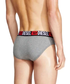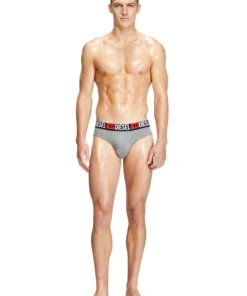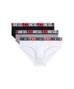 Three-pack of briefs in stretch cotton. The soft jacquard waistband is woven all-over with the Diesel logo and Denim Division D emblem.